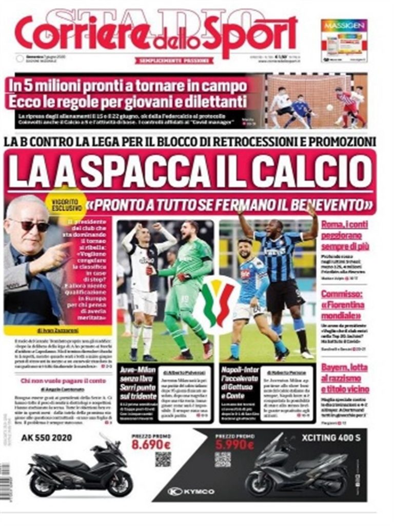 TORINO- Il Corriere dello Sport di oggi apre con un’intervista esclusiva al presidente del Benevento Vigorito. Il numero uno giallorosso si è detto infastidito dalla decisione della Lega di bloccare retrocessioni e promozioni per questa stagione, visto anche il primo posto in B dei campani. Spazio poi alla Coppa Italia. Fari puntati su Juve-Milan, match in cui i rossoneri dovranno far fronte a diverse assenze, mentre Sarri punta su un inedito tridente: