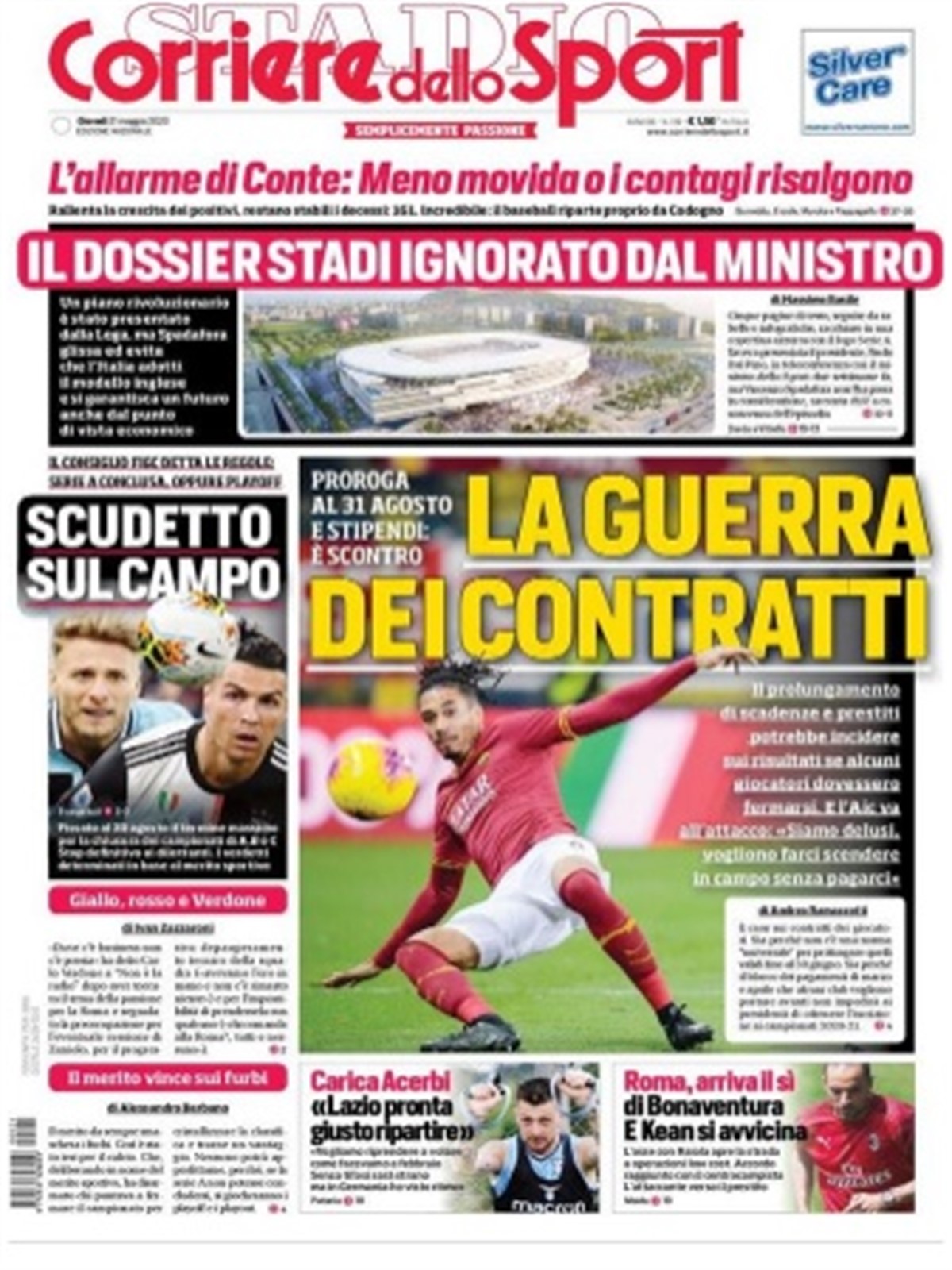 TORINO- L’apertura odierna del Corriere dello Sport si apre con il titolo “La guerra dei contratti”, che fa riferimento al prolungamento di contratti in scadenza e prestiti, che potrebbero incidere sui risultati del campionato in seguito alla sua ripresa. Serie A che potrebbe riprendere tra un mese, con lo spettro dei play-off che, però, non è stato ancora scongiurato del tutto. Infine, intervista esclusiva al difensore laziale Francesco Acerbi, che lancia la carica: