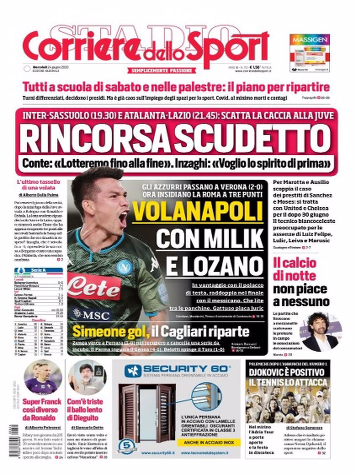 TORINO- Il Corriere dello Sport in edicola oggi apre parlando della lotta scudetto. Oggi in campo la Lazio (a Bergamo con l’Atalanta) e l’Inter (in casa con il Sassuolo) vanno a caccia dei tre punti per avvicinare la Juve in classifica. Continua intanto il buon momento del Napoli che, dopo il successo in Coppa Italia, vince 2-0 a Verona grazie alle reti di Milik e Lozano. Intanto monta la protesta dell’associazione consumatori, contraria alle partite giocate in tarda serata: