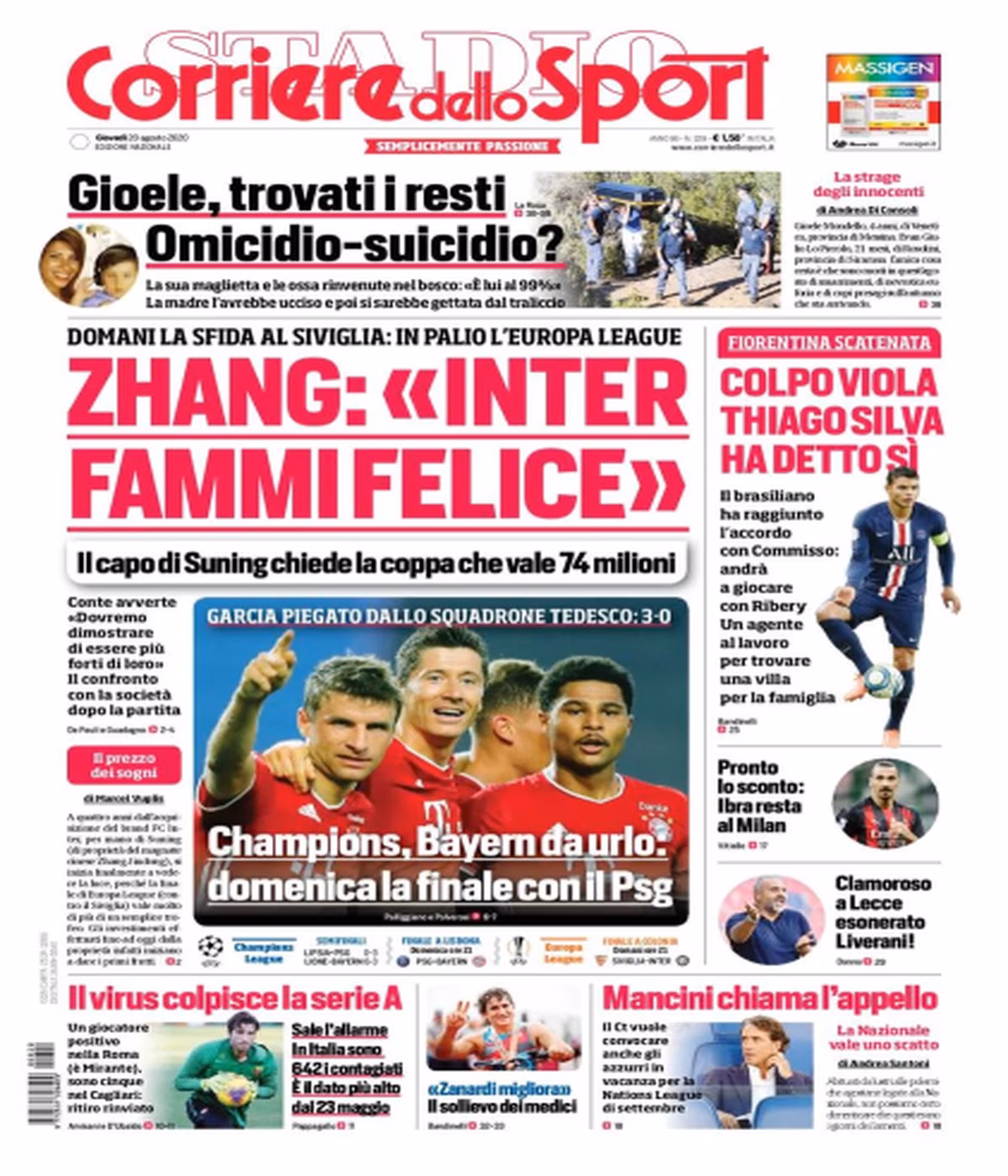 TORINO- Il Corriere dello Sport in edicola oggi apre con il messaggio di Zhang, che chiede alla sua Inter di portare a casa l’Europa League come ultimo sforzo di questa stagione. La finale di Champions, invece, vedrà il Bayern Monaco opposto al Psg, dopo che i bavaresi si sono sbarazzati per 3-0 del Lione in semifinale. Mercato: Thiago Silva dice si alla Fiorentina, mentre il Milan lavora al rinnovo di Ibrahimovic: