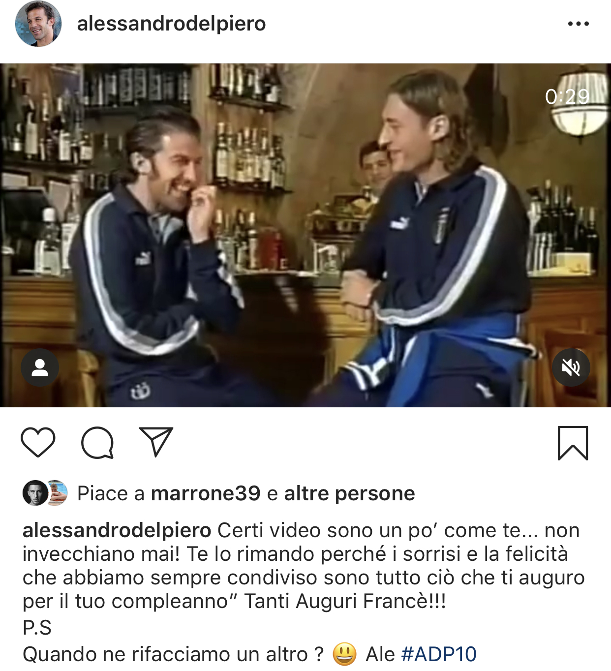 L’ex numero 10 bianconero ha difatti postato sul proprio profilo Instagram il video di un mitico spot girato insieme all’ex capitano giallorosso che ha commentato. ironicamente in questo modo: “Certi video sono un pò come. te….non invecchiano mai! Te lo rimando perché i sorrisi e la felicità che abbiamo sempre condiviso sono tutto ciò che ti auguro per il tuo compleanno “Tanti auguri France!!!”. P.S.: Quando ne rifacciamo un altro?”.