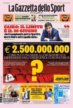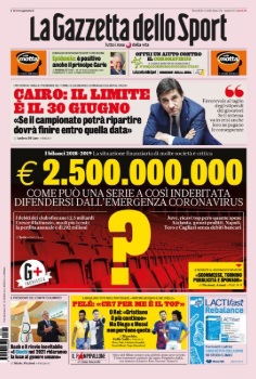 TORINO- L’edizione odierna della Gazzetta dello Sport si apre con una domanda: “Come può una serie A così indebitata difendersi dal Coronavirus?”. I debiti dei club sono infatti preoccupanti e passano di molto i 2 miliardi di euro. Sempre sulla questione Coronavirus è intervenuto il presidente del Torino Urbano Cairo, che ha posto il limite della scadenza del campionato al 30 giugno. Infine, spazio per il rinvio al 2021 delle Olimpiadi e per le dchiarazioni di Pelè su Cristiano Ronaldo: