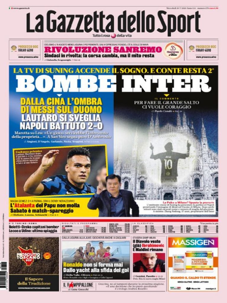 TORINO- Sulla prima pagina della Gazzetta dello Sport di oggi l’Inter è assoluta protagonista. La squadra di Conte, dopo il successo di ieri sera sul Napoli per 2-0, mantiene il secondo posto in attesa del match di sabato con l’Atalanta, sognando poi il colpaccio Messi per la prossima annata. In casa Milan, intanto, arriva la conferma della permanenza di Maldini, mentre Cristiano Ronaldo si rilassa con la sua Gerogina prima di riaprire la caccia ad Immobile: