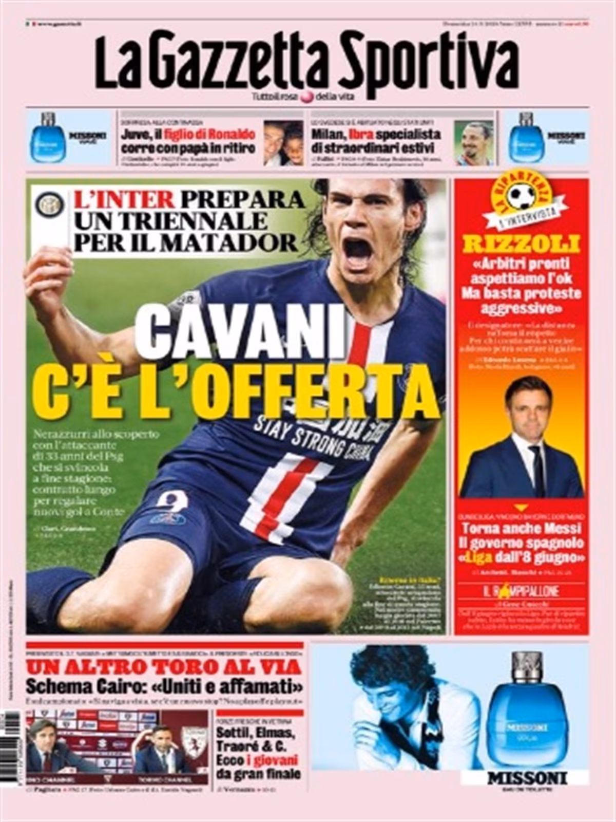 TORINO- La Gazzetta dello Sport in edicola oggi apre con l’interessamento dell’Inter nei confronti di Edinson Cavani, che a breve vedrà scadere il proprio contratto con il Psg. Per l’uruguaiano pronto un ricco e lungo legame con i nerazzurri. In casa Juve, invece, si pensa a lavorare al JTC, con Ronaldo che ha avuto l’occasione di allenarsi da vicino con il figlioletto. Intervista esclusiva al designatore arbitrale Nicola Rizzoli, che dichiara pronta la classe arbitrale in caso di ripresa del campionato: