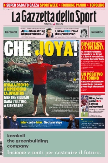 TORINO- La prima pagina della Gazzetta dello Sport di oggi è tutta dedicata a Paulo Dybala, che ieri ha ricevuto la comunicazione ufficiale della sua guarigiona al Coronavirus. La Joya, ora, potrebbe superare nelle gerarchie di Sarri Gonzalo Higuain, che non ha ancora fatto il suo rientro in Italia. Rimanenado su questo tema, il Torino ha comunicato la positività di un giocatore, mentre Ibrahimovic sta preparando il proprio ritorno a Milano: