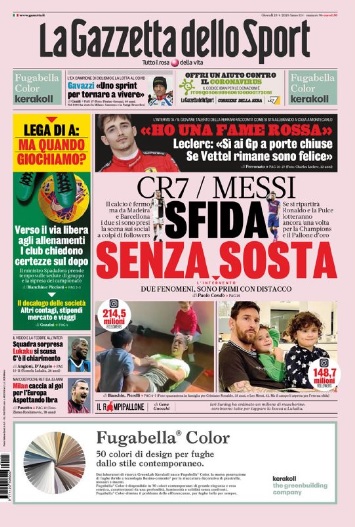 TORINO- La Gazzetta dello Sport in edicola oggi apre con l’ennesimo capitolo dell’eterna sfida tra Cristiano Ronaldo e Lionel Messi. I due, in questo periodo di quarantena, stanno continuando ad allenarsi e, in caso ripartisse la stagione, sono pronti a giocarsi di nuovo la Champions e il pallone d’oro. Spazio poi per le due milanesi, con Lukaku che fa dei chiarimenti in casa Inter e Ibra chiamato a risollevare il Milan, mai così poche volte in gol negli ultimi 33 anni: