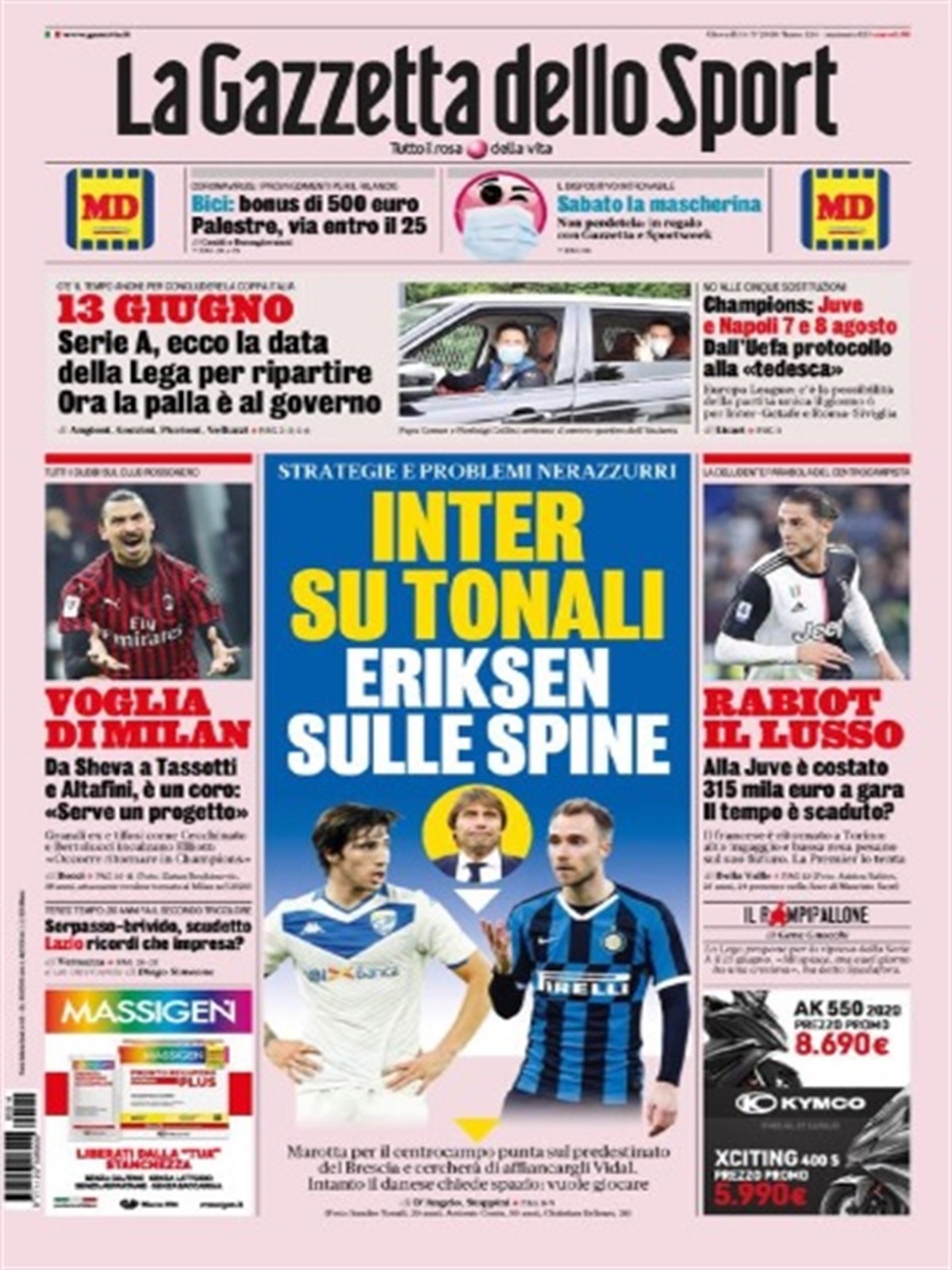 TORINO- L’edizione odierna della Gazzetta dello Sport si apre parlando del futuro di Sandro Tonali, gioiello del Brescia conteso da Juventus e Inter (che vuole anche Vidal dal Barcellona). Capitolo bianconero: si continua a parlare di Rabiot, costato 315.000 euro a gara e per cui potrebbe essere giunto il momento di salutare. Infine, inevitabile parlare del futuro della Serie A e delle coppe europee. La prima potrebbe riprendere dal 13 giugno, mentre per Champions ed Europa League se ne riparlerebbe ad inizio agosto: