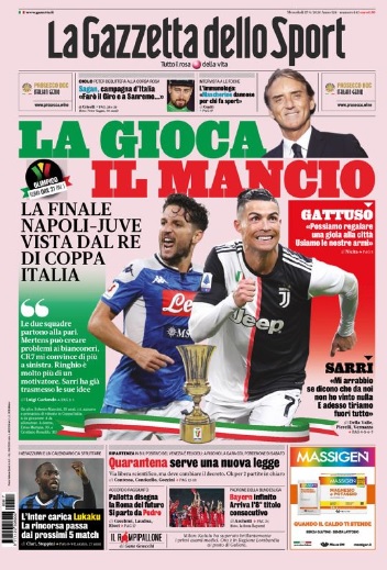 TORINO- La Gazzetta dello Sport in edicola oggi apre parlando della finale di Coppa Italia tra Juve e Napoli, che si giocherà stasera all’Olimpico. Il ct della Nazionale Roberto Mancini, intervistato per l’occasione, ha fatto le sue analisi sulle due squadre. L’Inter, intanto esclusa dalla coppa, pensa al campionato e cerca di ritrovare il suo bomber principe Lukaku, a secco contro gli azzurri. Capitolo Serie A: via libera a due partite trasmesse in chiaro: