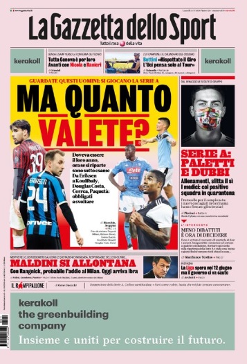 TORINO- L’edizione odierna della Gazzetta dello Sport apre con una domanda: “Quanto valete?” diretta a giocatori come Douglas Costa, Eriksen, Paquetà, Correa e Koulibaly che, in caso di ripartenza, dovranno dare una netta sterzata alla loro stagione. In casa Milan, intanto, possibile addio di Maldini in caso di arrivo in panchina del tedesco Rangnick. Capitolo ripresa: slitta la data di inizio degli allenamenti e i medici comunicano che, in caso di nuovi positivi, verrà messa in quarantena tutta la squadra di cui fa parte il tesserato: