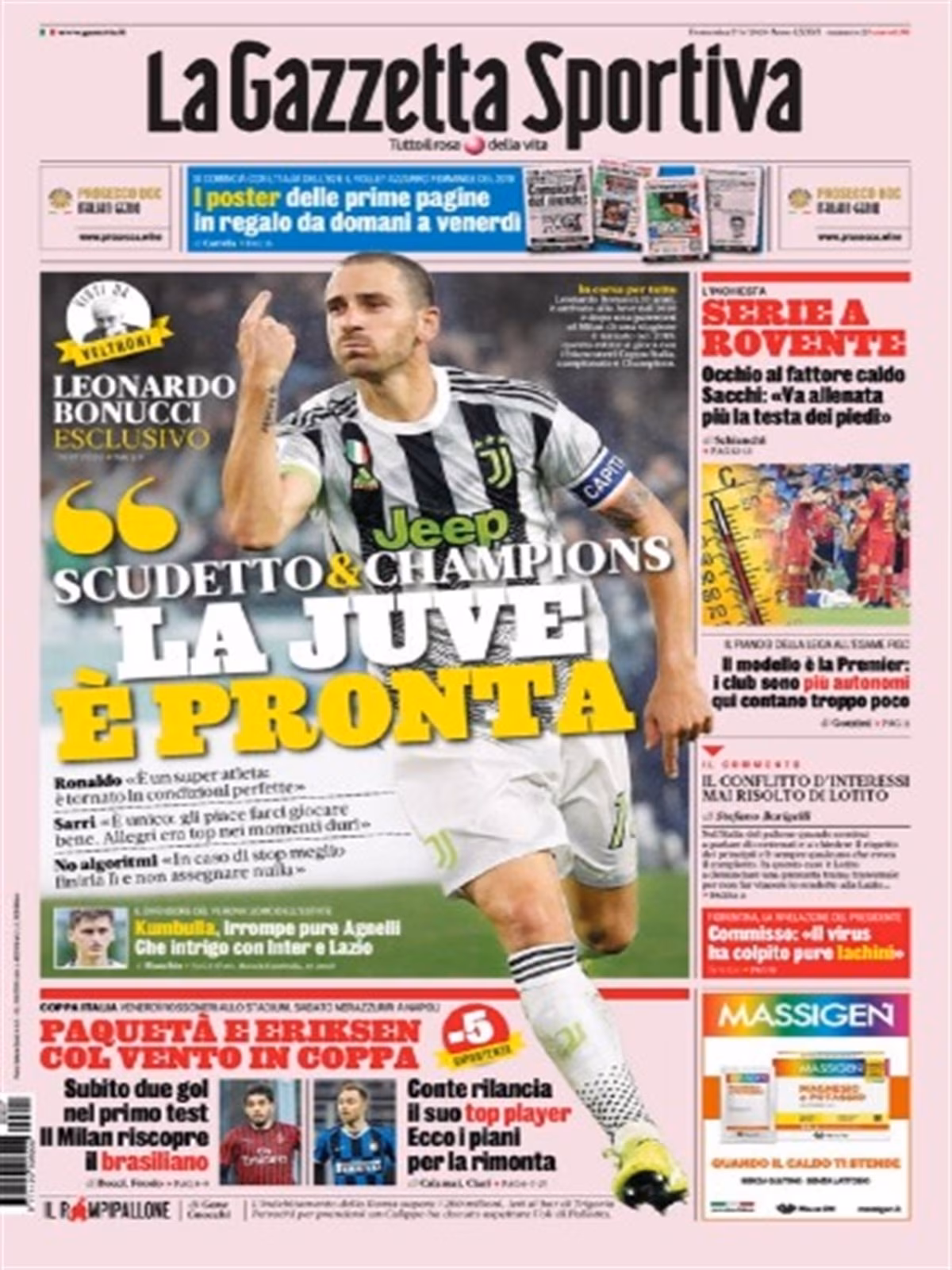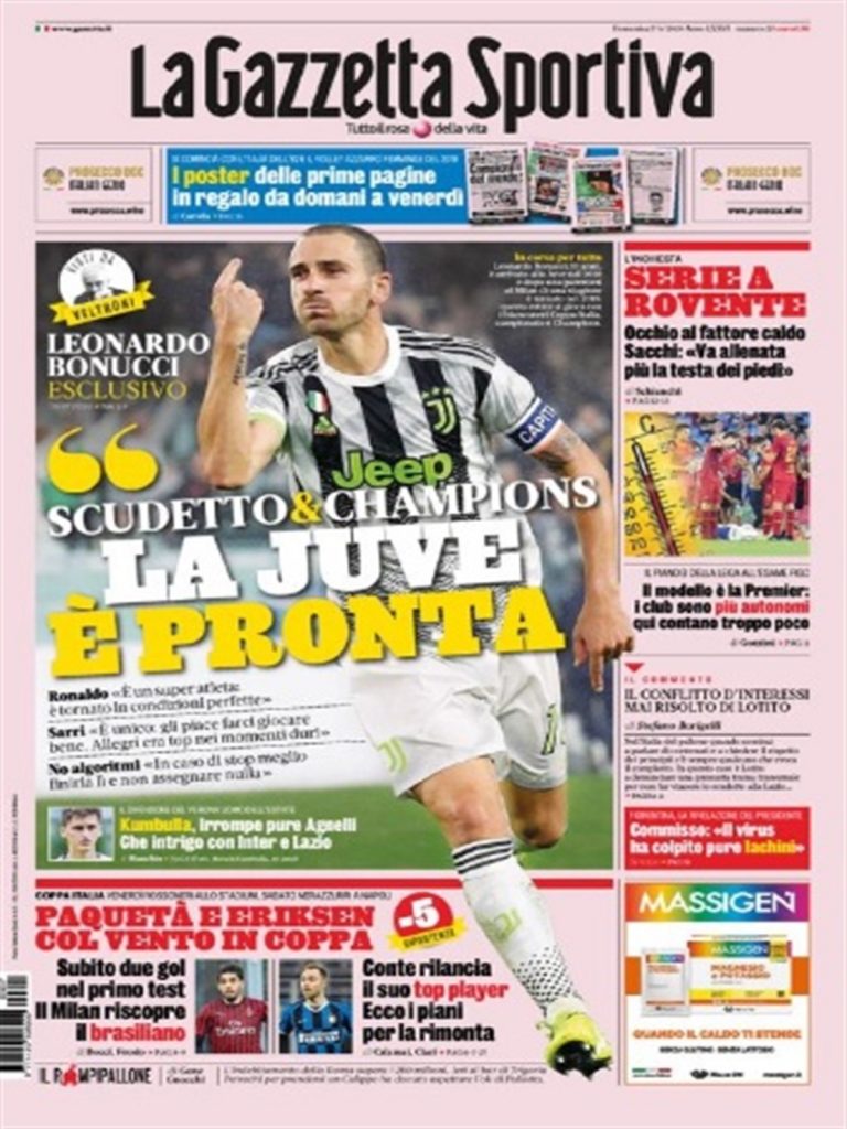 TORINO- La prima pagina di oggi della Gazzetta dello Sport si apre con un’intervista esclusiva a Leonardo Bonucci. Da Cristiano Ronaldo a mister Sarri, il numero 19 della Juventus dice la sua. Capitolo acquisti: i bianconeri irrompono fortemente su Marash Kumbulla, difensore albanese del Verona, seguito anche da Inter e Lazio. Serie A, il problema più grande da risolvere, ora è il caldo, che per Arrigo Sacchi potrebbe influire molto sul rendimento dei calciatori: