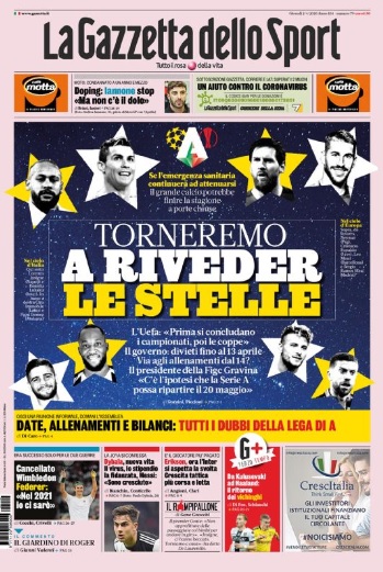TORINO- L’edizione oggi in edicola della Gazzetta dello Sport si apre con una notizia molto importante. Come comunicato dalla UEFA, c’è la volontà di chiudere i campionati (e conseguentemente anche le coppe europee) e, se la situazione Coronavirus dovesse continuare ad attenuarsi, le possibilità di finire la stagione a porte chiuse aumenterebbero. Spazio poi per la situazione Dybala, migliorata dopo il Covid-19 e la cancellazione di Wimbledon: