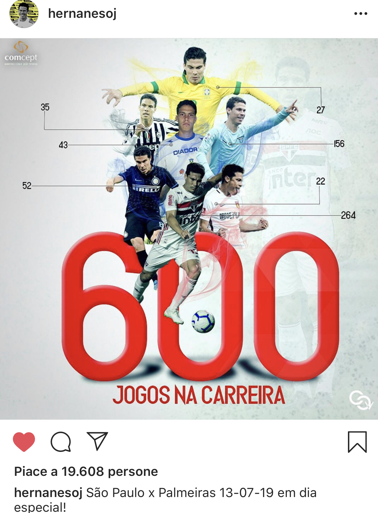 La partita giocatasi il 13 Luglio tra San Paolo e Palmeiras non è stata una sfida “normale” per Hernanes che in questa occasione ha disputato la seicentesima gara ufficiale nella sua carriera. Il brasiliano ha voluto celebrare questo importante traguardo postando sul proprio profilo Instagram un collage con le maglie di tutte le sue ex squadre, tra cui anche la Juventus, club con cui ha giocato 35 partite.