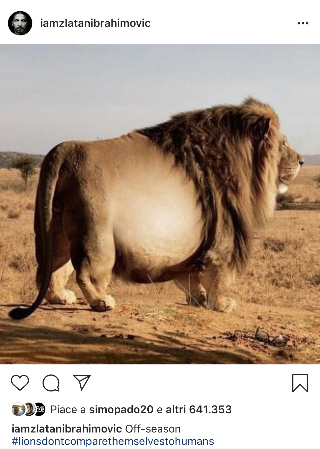 divulgato una foto di un leone con un’evidente pancia commentandola con la frase “Off-season” e l’immancabile hashtag “#i leoni non si confrontano con gli esseri umani”. Lo svedese ha così voluto scherzare sul suo stato di forma che difficilmente non sarà perfetto come al solito in attesa della stagione in Mls dove ripartirà con i suoi Los Angeles Galaxy che lo aspettano a braccia aperte.