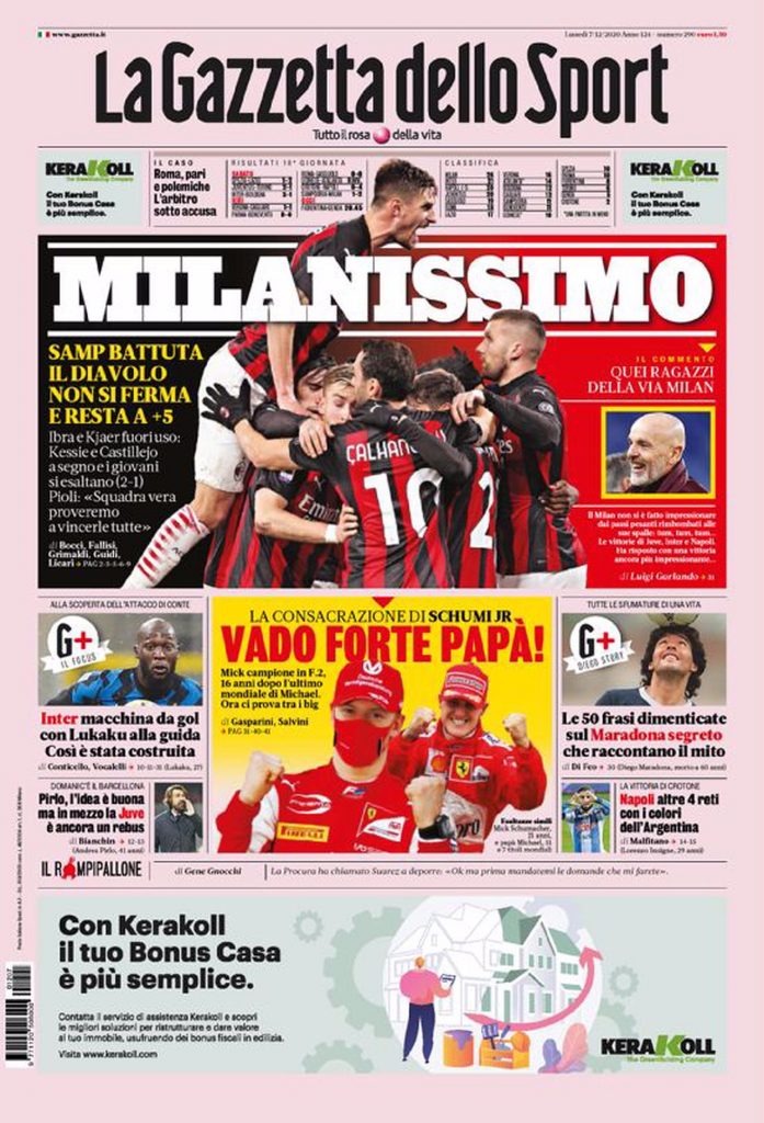 TORINO – La prima pagina de La Gazzetta dello Sport intitola così: “Milanissimo”. Il riferimento è alla vittoria del Milan sulla Sampdoria. La squadra di mister Pioli rimane dunque a +5 dalle inseguitrici.
