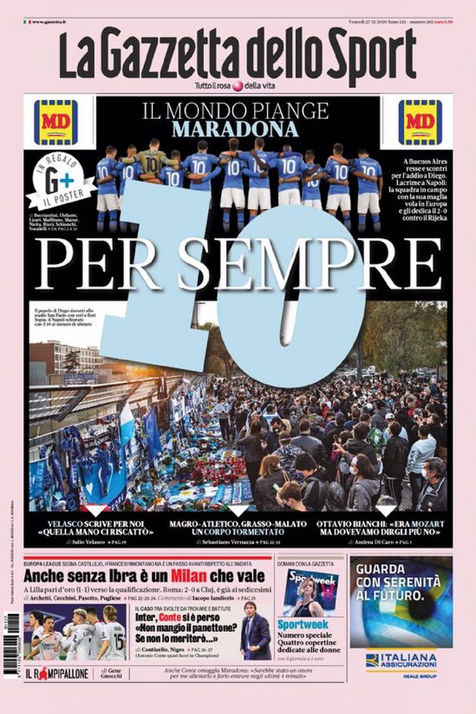 TORINO – La prima pagina de La Gazzetta dello Sport intitola così: “Per sempre”. Il riferimento è al ricordo dei tifosi napoletani ieri sera al San Paolo per la morte di Diego Armando Maradona.