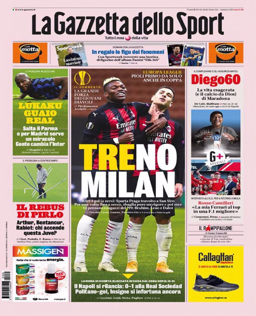 TORINO – La prima pagina de La Gazzetta dello Sport intitola così: “Treno Milan”. Il riferimento è alla vittoria dei rossoneri per 3-0 in Europa League contro lo Sparta Praga che ha regalato tre punti e primo posto alla squadra di Pioli nel girone.