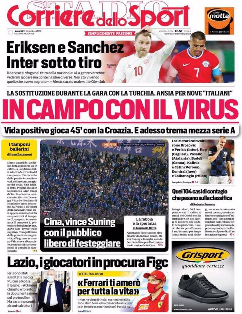 TORINO – La prima pagina del Corriere dello Sport intitola così: “In campo con il virus”. Il riferimento è al difensore della Croazia, Vida, che è sceso in campo con il coronavirus ed ora sono a rischio contagio nove “italiani”.