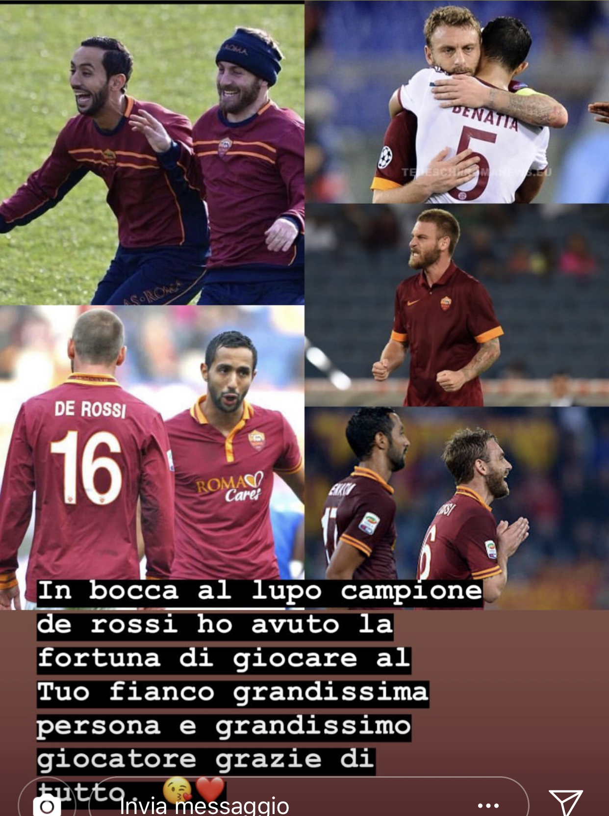 Mehdi Benatia, ex bianconero ma anche giallorosso, non ha mancato di salutare con una “story” sul suo profilo ufficiale di Instagram l’addio alla Roma annunciato quest’oggi da Daniele De Rossi.