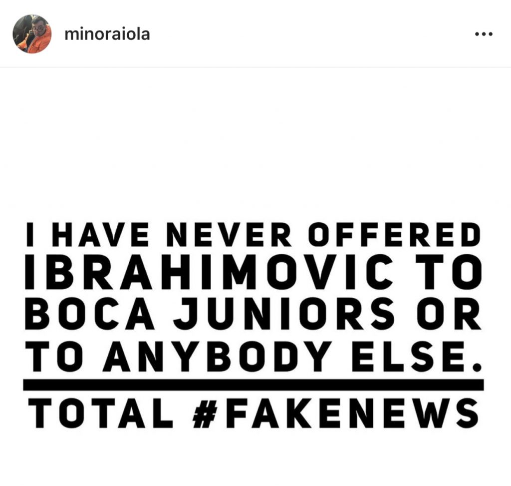 “Non ho mai offerto Ibrahimovic al Boca Juniors o a qualsiasi altra squadra. Quelle che circolano sul web sono solamente “Fake News””. Questo il testo del post pubblicato dal noto agente che ha voluto direttamente spazzare via ogni qualsiasi voce legate allo svedese.