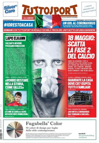 TORINO- L’edizione odierna di Tuttosport apre con gli ultimi aggiornamenti sulla ripresa del campionato di Serie A. Il ministro Spadafora ha sottolineato l’importanza dello sport in questo momento, con la Fase 2 del calcio pronta a partire dal 18 di maggio. Focus su Cristiano Ronaldo, di cui è stata analizzata la situazione in Portogallo e la mega villa in cui ospita tutti i parenti, e spazio alle dichiarazioni di Lapo Elkann e il suo progetto contro il Coronavirus: