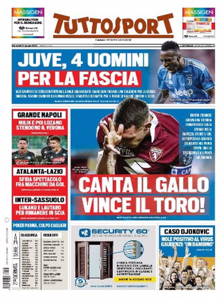 TORINO- Tuttosport in edicola oggi apre parlando del successo del Torino ai danni dell’Udinese, firmato da capitan Belotti, che allontana ulteriormente la zona rossa della classifica. In casa Juve, intanto, Maurizio Sarri fa i conti con il problema terzini. Venerdì, contro il Lecce, a sinistra dovrebbe toccare a Matuidi, visti i ko di De Sciglio e Alex Sandro e la squalifica di Danilo. Spazio poi ad Inter-Sassuolo e Atalanta-Lazio, sfide di cartello di questa giornata di Serie A: