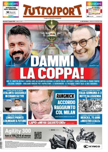 TORINO- Tuttosport in edicola oggi apre parlando della Coppa Italia, in palio stasera nel match tra la Juventus ed il Napoli. Sia Maurizio Sarri che Rino Gattuso vanno a caccia del loro primo trofeo da allenatori in Italia. Capitolo Milan: il club rossonero avrebbe raggiunto l’accordo per l’approdo di Rangnick sin panchina a partire dalla prossim stagione. Serie A, la partita tra Sassuolo ed Atalanta sarà trasmessa in chiaro su Tv8: