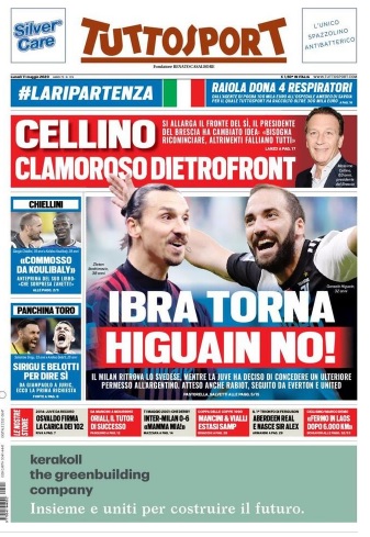 TORINO- Tuttosport in edicola oggi apre con il punto sul ritorno in Italia di alcuni calciatori ancora attualmente all’estero. Si citano gli esempi di Ibrahimovic (che sta per tornare) e Higuain (al quale verrà concesso un ulteriore permesso). Atteso in Italia Rabiot, di cui si parla anche in ottica cessione, visti gli interessi di Everton e United. A tenere banco, poi, sono le scelte del presidente del Brescia Massimo Cellino, ora favorevole alla ripresa del campionato a differenza di quanto comunicato nelle scorse settimane: