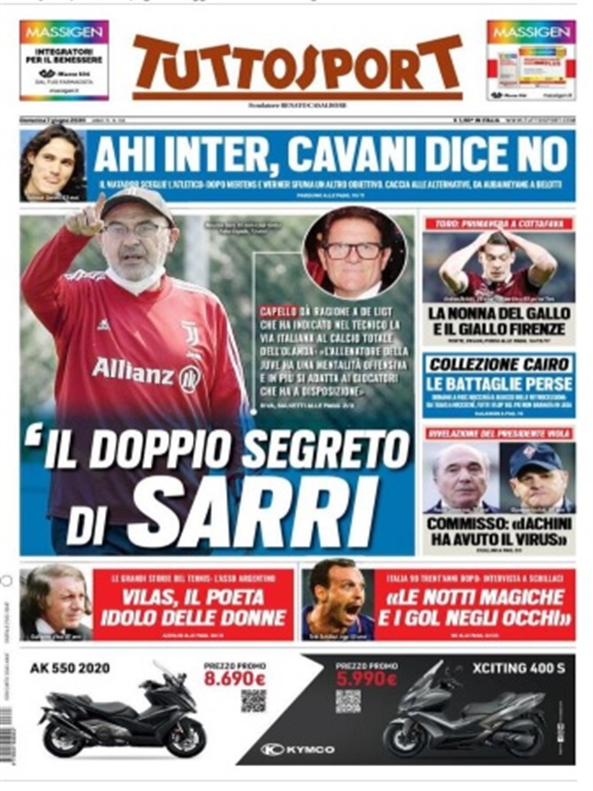 TORINO- L’edizione odierna di Tuttosport si apre con un’intervista esclusiva a Fabio Capello, che tramite le sue dichiarazioni ha voluto tessere le lodi di Maurizio Sarri, ritenuto dall’ex tecnico bianconero la risposta italiana al calcio totale olandese. In casa Fiorentina, intanto, il presidente Rocco Commisso ha svelato che mister Iachini è stato positivo al Coronavirus. L’Inter, intanto, deve fronteggiare il rifiuto di Cavani ad aggregarsi alla banda Conte: