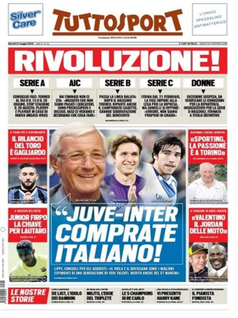 TORINO- La prima pagina di oggi di Tuttosport si apre con un’intervista esclusiva a Marcello Lippi, che consiglia Juve ed Inter sui possibili acquisti. L’ex Ct ha detto di puntare su Chiesa e Tonali, da lui considerati i migliori talenti emergenti del calcio italiano, anche per merito di Roberto Mancini. Spazio poi alla possibile ripresa del campionato, che dovrebbe riprendere dalla Serie A alla Serie C, mentre non c’è ancora una decisione in merito a quello femminile. Capitolo mercato: Torino su Gagliardini, Inter su Junior Firpo, considerato la possibile contropartita per portare Lautaro a Barcellona: