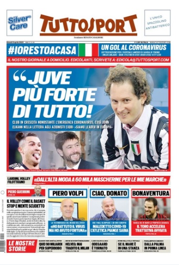 TORINO- L’edizione odierna di Tuttosport apre parlando di Juve, concentrandosi in particolar modo sulla lettera scritta nella giornata di ieri da John Elkann agli azionisti Exor. Il club bianconero è “più forte di tutto” e nonostante l’emergenza Coronavirus è in grande crescita anche all’estero. Spazio poi al mercato, con il Torino che sogna l’arrivo di Bonaventura, e al ricordo di Donato Sabia, scomparso ieri dopo essere risultato positivo al Covid-19: