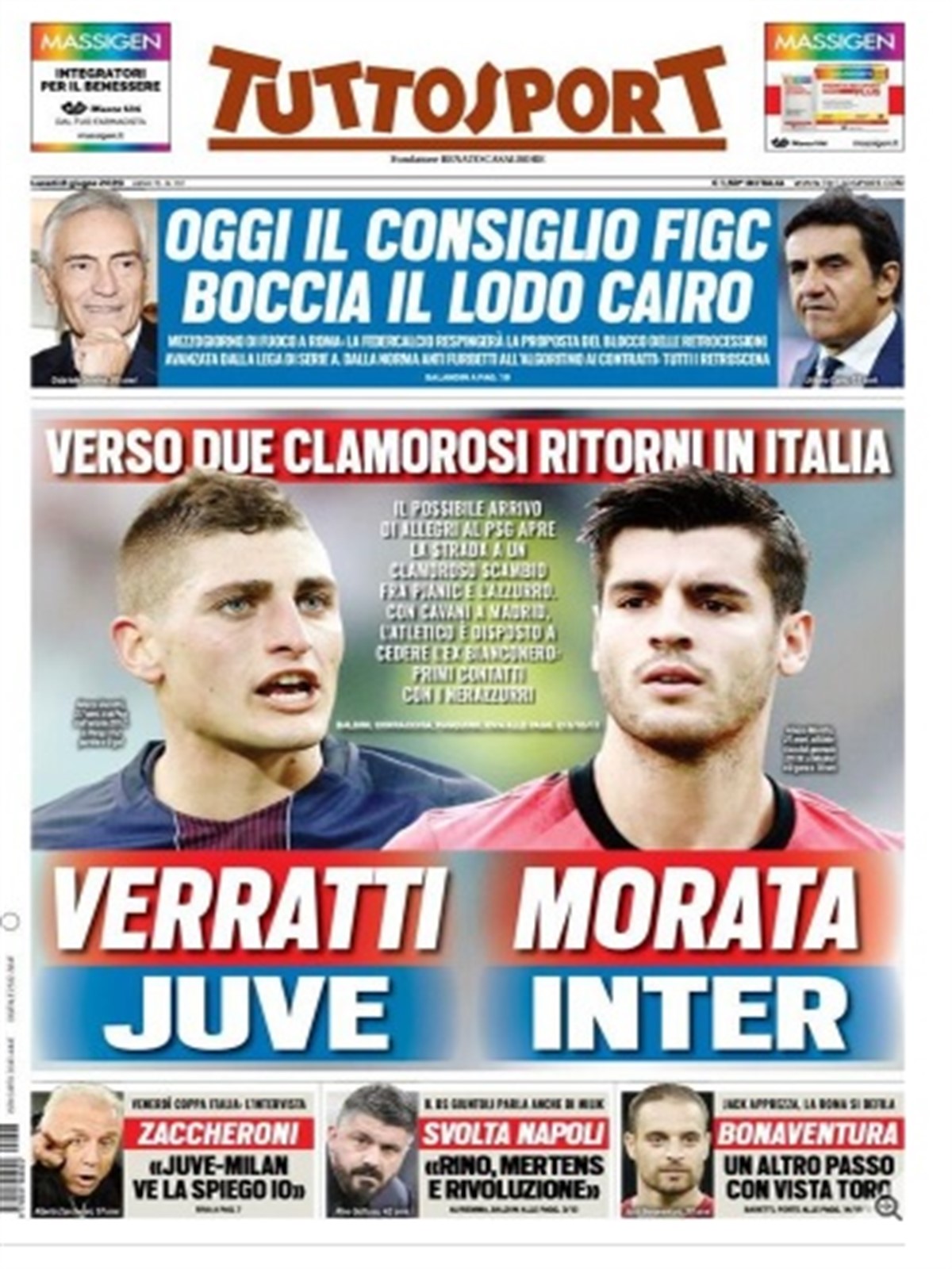 TORINO- Il mercato è protagonista sulla prima pagina di Tuttosport in edicola quest’oggi. In casa Juve, con il possibile passaggio di Allegri al Psg, sta avanzando l’idea di uno scambio tra Miralem Pjanic (pupillo del tecnico livornese) e Marco Verratti. L’Inter, però, non vuole restare a guardare e sarebbe pronta a rispondere con il colpo Morata. L’ex bianconero, visto il probabile arrivo di Cavani, sarebbe di troppo all’Atletico Madrid. Capitolo Serie A, la FIGC sarebbe pronta a bocciare l’idea del blocco delle retrocessioni proposta dalla Lega Serie A: