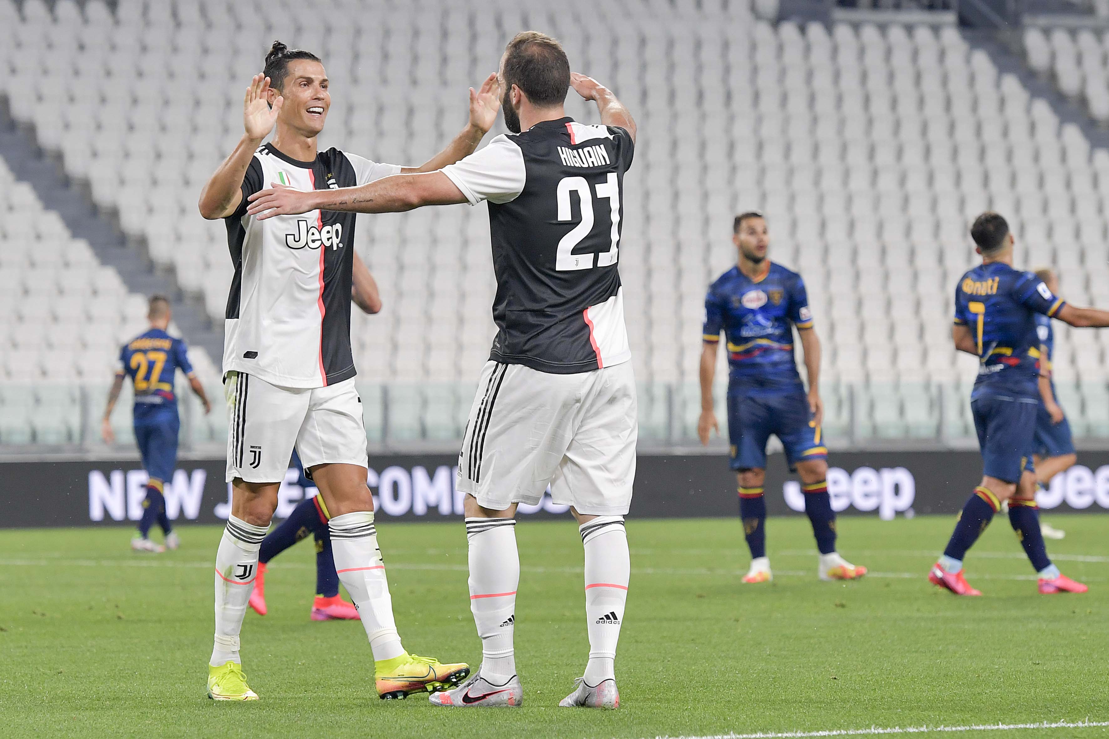 TURIN, ITALY - JUNE 26: Gonzalo Higuain celebrates after scoring his team's third goal with teammate Cristiano Ronaldo during the Serie A match between Juventus and US Lecce at Allianz Stadium on June 26, 2020 in Turin, Italy. (Photo by Daniele Badolato - Juventus FC/Juventus FC via Getty Images)