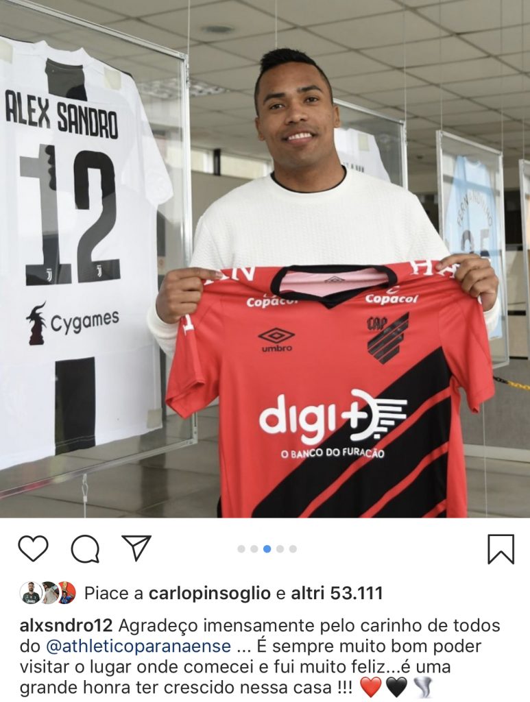 Il terzino sinistro ha deciso di trascorrere una giornata all’insegna dei ricordi visto che è passato a visitare il club dove è calcisticamente nato, l’Atletico Paranense. Il brasiliano ha postato sul proprio profilo Instagram una foto con la maglia della formazione rosso-nera in mano ed una sua maglia bianconera già messa in quadro nella bacheca della società carioca.