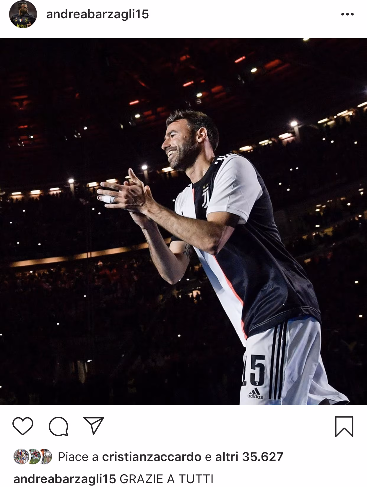 Andrea Barzagli dopo il tributo e la festa vissuta la scorsa settimana all’Allianz Stadium di Torino quando è stato salutato da tutto il popolo bianconero, quest’oggi, pur non essendo sceso in campo a Marassi per l’ultima stagionale, ha voluto ringraziare ancora una volta tutti con un post su Instagram commentato dal difensore con un semplice: “Grazie a tutti”.