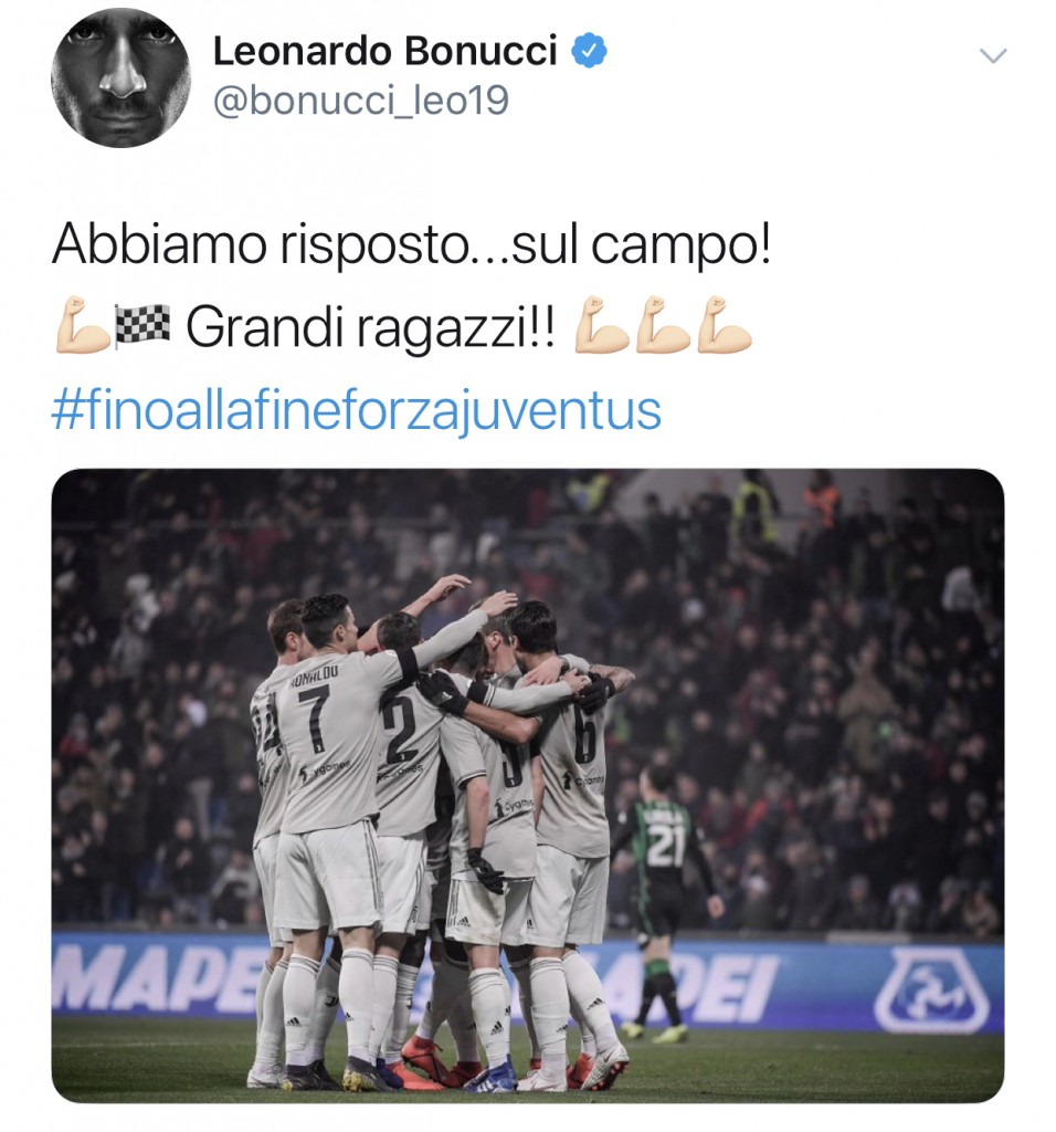 si complimentato coi suoi compagni di squadra per la ritrovata vittoria contro il Sassuolo, sconfitto con un netto 0 a 3 a Reggio Emilia. Il centrale ha commentato la foto che ritrae il gruppo bianconero intento a festeggiare la rete di Khedira scrivendo: “Abbiamo risposto…sul campo! Grandi ragazzi!!”