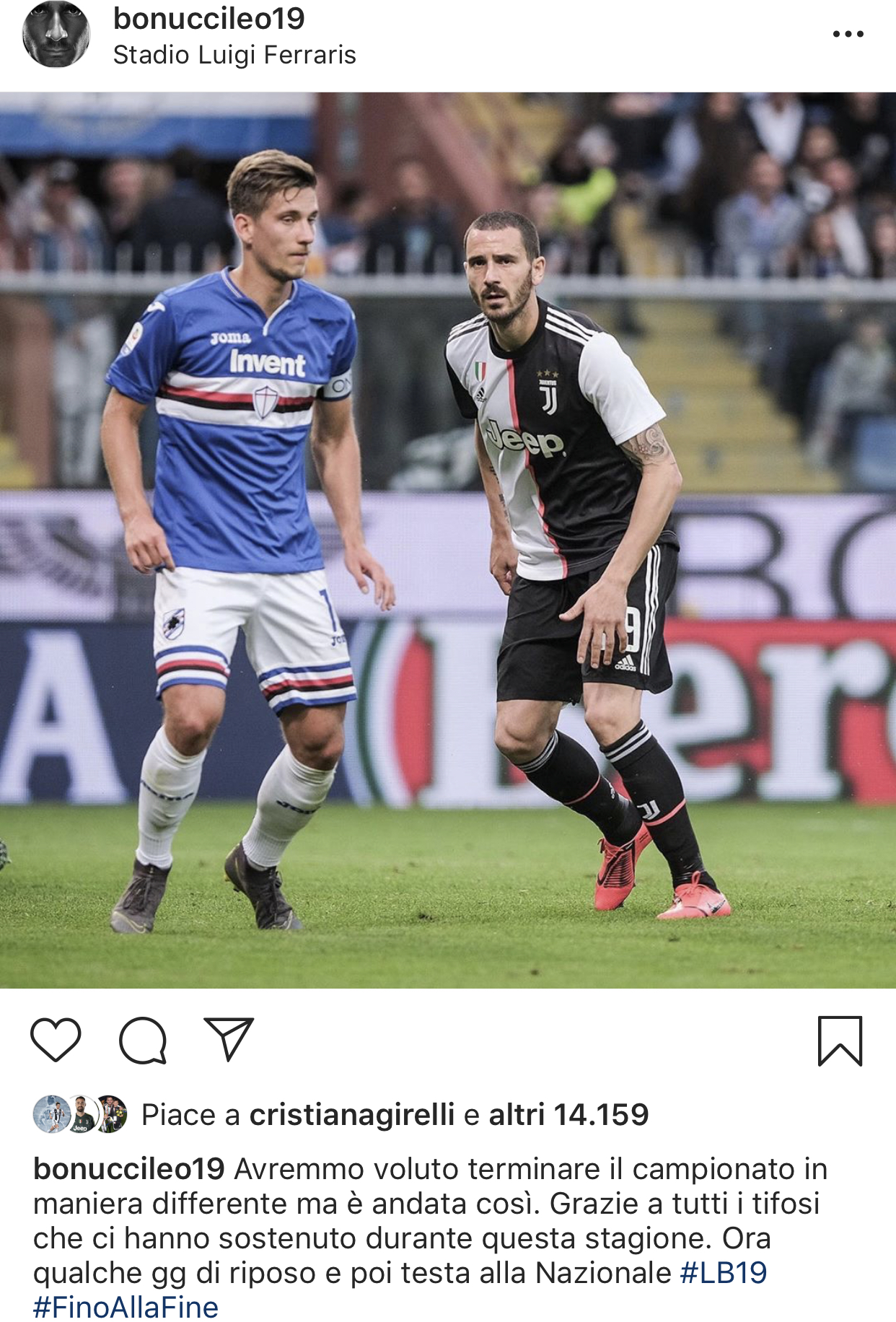 Leonardo Bonucci ha voluto concludere la sua stagione pubblicando un post su Instagram col quale ha mostrato un pò di rammarico per la sconfitta subita questa sera a Marassi. Ecco come ha commentato la foto postato: “Avremmo voluto terminare il campionato in maniera differente ma è andata così. Grazie a tutti i tifosi che ci hanno sostenuto durante questa stagione. Ora qualche gg di riposo e poi testa alla Nazionale #LB19 #FinoAllaFine”.