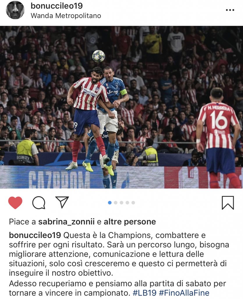 Leonardo Bonucci, oltre ad aver parlato ai microfoni di Sky, al termine della sfida pareggiata contro l’Atletico Madrid, ha voluto condividere anche coi propri fan su Instagram le sensazioni del dopo-gara.