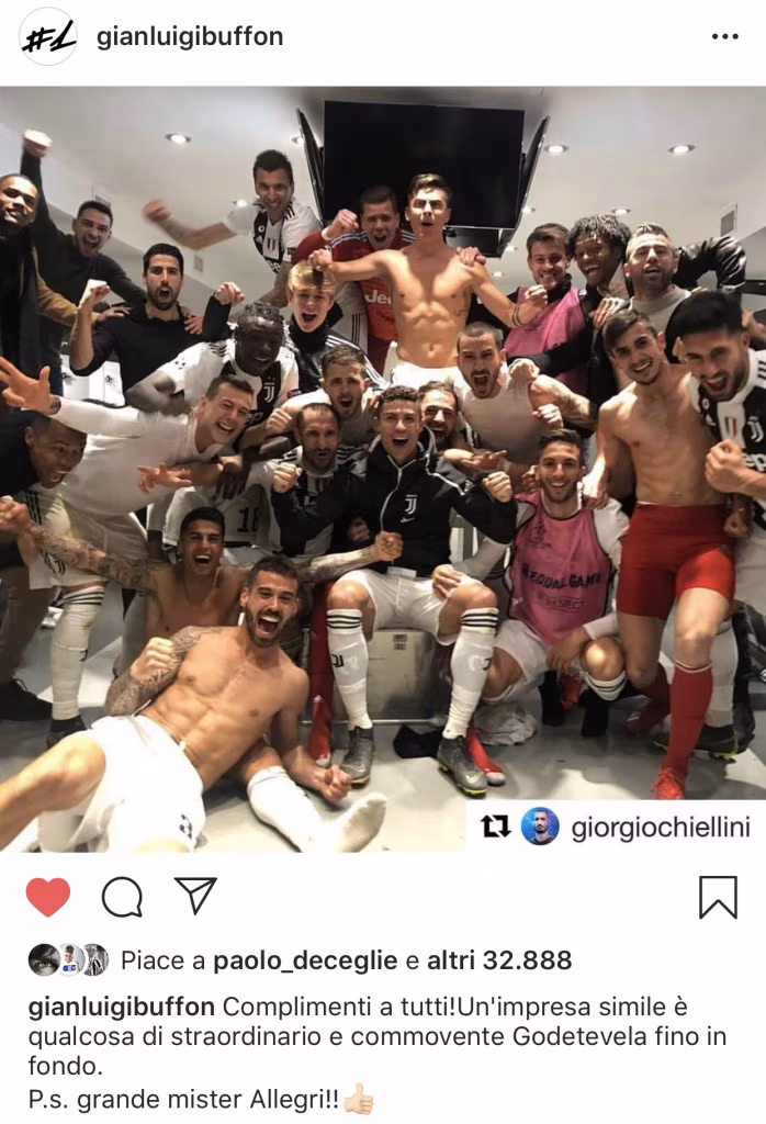 Gianluigi Buffon è stato uno dei primi a complimentarsi sui social network ripostando la foto di Giorgio Chiellini che ritrae tutto lo spogliatoio bianconero in festa.