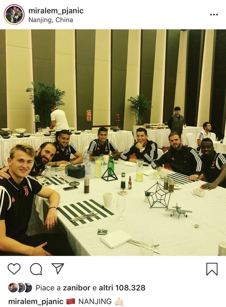 Miralem Pjanic ha postato poche ore fa una foto del cena trascorsa in compagnia di alcuni compagni di squadra: l’ultimo arrivato Mathjis De Ligt abbracciato dal ritrovato Higuain, Matheus Pereira, i due lusitani Joao Cancelo e Cristiano Ronaldo, il bosniaco numero 5 ed il francese Matuidi. Una foto dalla quale traspira il solito gruppo molto unito, che sta cercando di far inserire al meglio l’olandese De Ligt che sembra essersi legato molto a Pjanic e a Cristiano Ronaldo che aveva cercato di convincere ad accettare il trasferimento sotto la Mole.