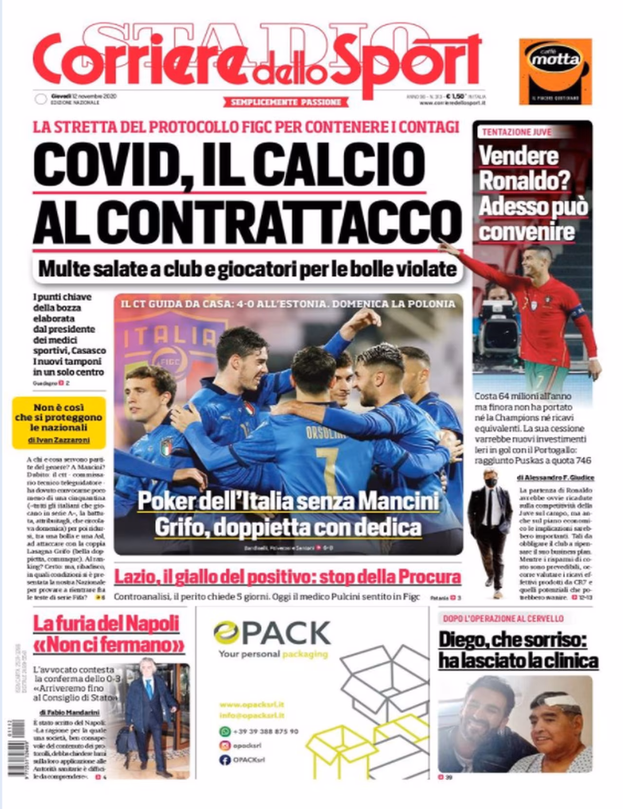 TORINO- Il Corriere dello Sport in edicola oggi apre con l’argomento Covid. Nel nuovo protocollo ci saranno multe salate per club e giocatori che violeranno le bolle. Spazio poi al successo dell’Italia sull’Estonia, nell’amichevole vinta con un rotondo 4-0. Si parla poi di una possibile cessione di Cristiano Ronaldo da parte della Juve, che non sarebbe più così convinta di spendere tanto all’anno per il giocatore: