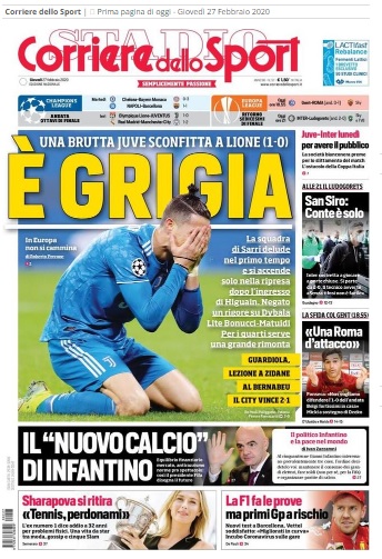 TORINO- Prima pagina odierna del Corriere dello Sport interamente dedicata alla Juventus, sconfitta a Lione per 1-0 nell’andata degli ottavi di Champions. “È grigia” titola il quotidiano romano, che parla di una squadra altamente deludente. Spazio poi all’altra gara tra Real e City, che ha visto gli uomini di Guardiola espugnare il Bernabeu per 2-1. Infine, lente puntata sull’Europa League, con Roma ed Inter in campo stasera nel ritorno dei sedicesimi: