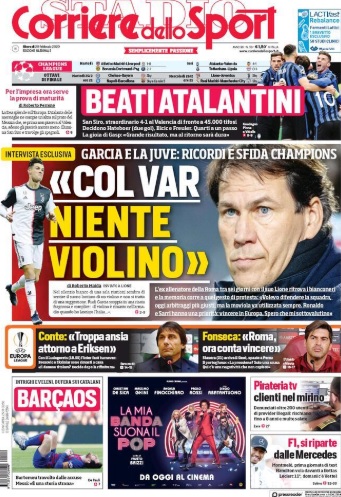 TORINO- Sul Corriere dello Sport di oggi la prima pagina è tutta per Rudi Garcia, tecnico del Lione che ha parlato dei suoi precedenti con la Juve, incluso quello del famoso “violino” nel 2014. Spazio in alto, ovviamente, dedicato all’impresa dell’Atalanta, che con il 4-1 rifilato al Valencia è ad un passo dalla storica qualificazione ai quarti di Champions League. Ci sono anche le dichiarazioni di Conte e Fonseca in conferenza, in vista delle gare contro Ludogorets e Gent che vedranno le due italiane impegnate in Europa League: