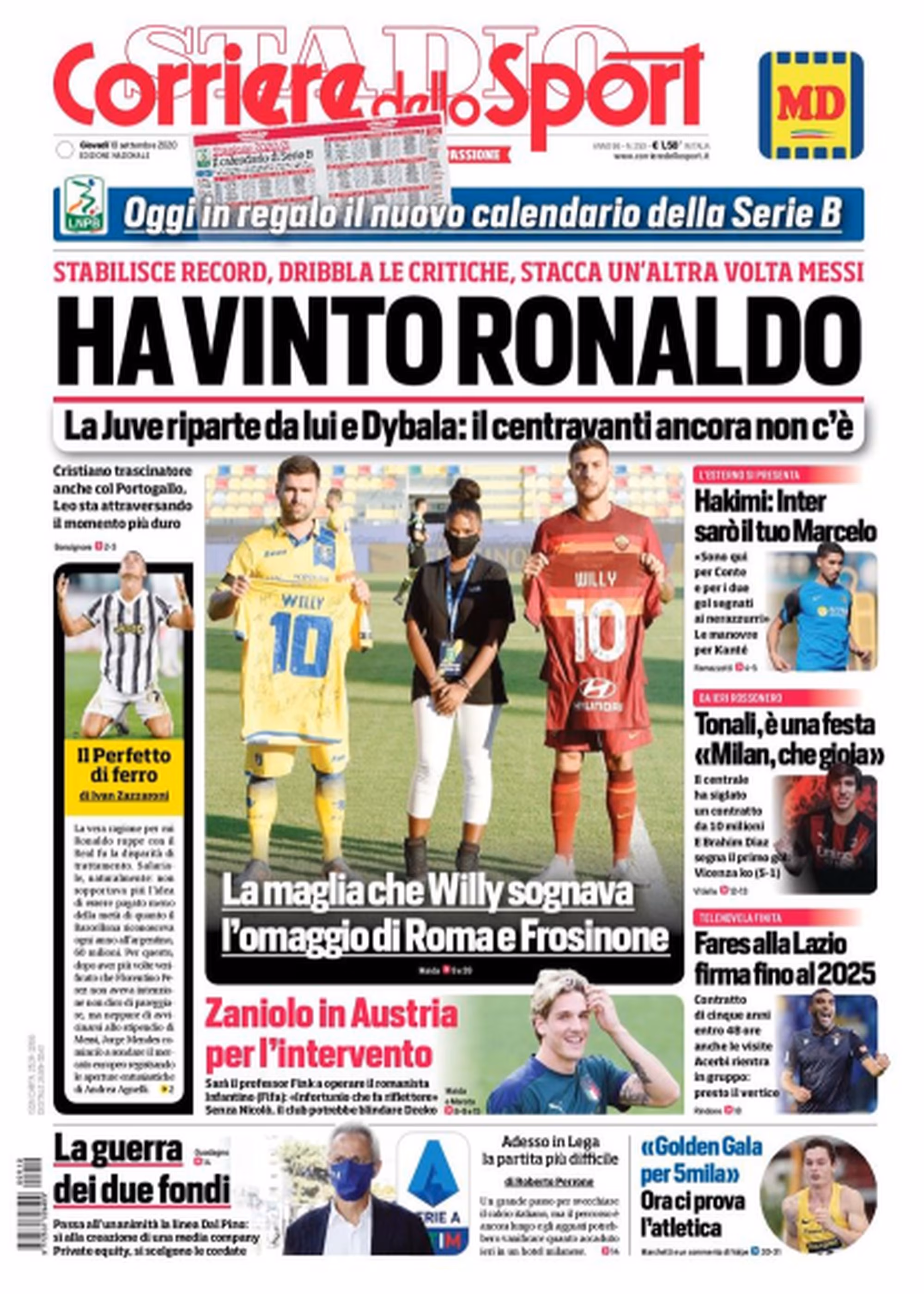 TORINO- Il Corriere dello Sport in edicola oggi apre parlando di Cristiano Ronaldo. Il portoghese è una delle certezze in casa Juventus e, dopo il record dei 101 gol in Nazionale, è pronto ad un’altra annata da protagonista in bianconero. Le milanesi continuano a rinforzarsi: il Milan ha ufficializzato l’arrivo di Tonali, mentre Hakimi lancia la sfida scudetto dall’Inter. Situazione Zaniolo: il talento romanista è pronto ad un nuovo intervento al crociato: