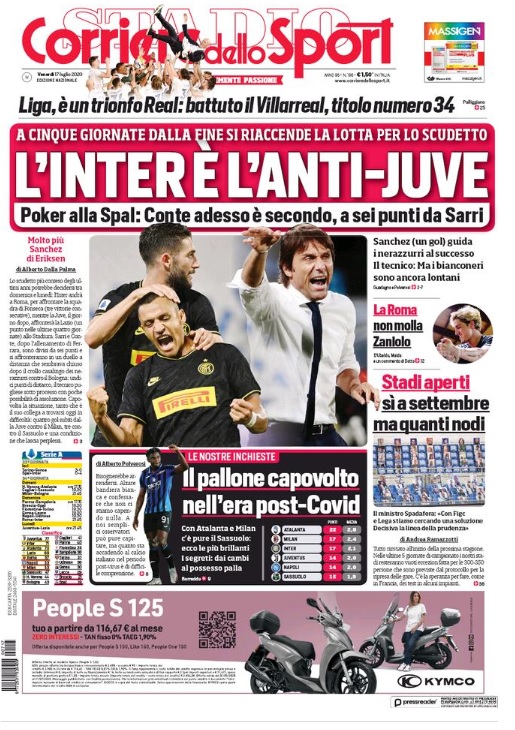 TORINO- Il Corriere dello Sport in edicola oggi apre con il successo dell’Inter a Ferrara ai danni della Spal. Rotondo 4-0 in favore degli uomini di Conte, che ora si portano a soli 6 punti in classifica dalla Juve capolista. In Spagna, invece, giochi chiusi per il titolo, con il Real Madrid che si è ufficialmente laureato campione. Capitolo mercato: la Roma non ha intenzione di privarsi di Nicolò Zaniolo: