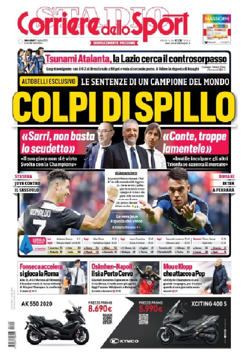 TORINO- Il Corriere dello Sport in edicola oggi apre con un’intervista ad Alessandro Altobelli. L’ex attaccante parla delle situazioni in casa Juve ed Inter, sue ex squadre. Ai bianconeri non basterebbe lo scudetto, visto il gioco espresso non al massimo fin qui. In casa nerazzurra, invece, troppe sono le lamentele di Conte per l’ex campione del mondo. Nel primo anticipo della trentareesima giornata, intanto, l’Atalanta schianta il Brescia con un perentorio 6-2: