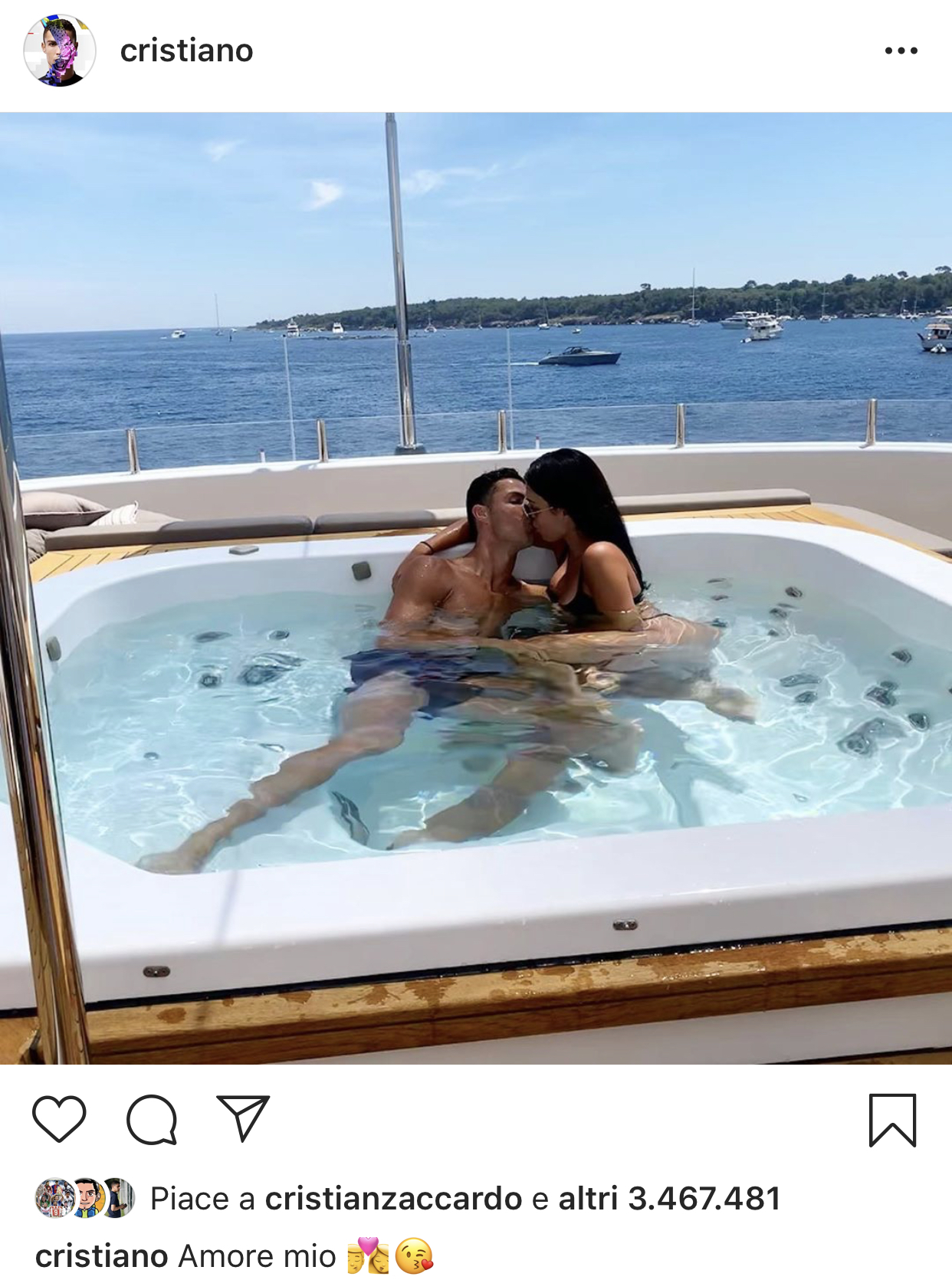 Il portoghese sta aggiornando quasi quotidianamente i suoi fans mostrando foto e video dallo stupendo yacht su cui ricaricando le batterie in vista della nuova stagione. CR7 naturalmente sta vivendo le sue vacanze in compagnia della famiglia, a partire dalla sua compagna Georgina Rodriguez con cui l’intesa è ai massimi livelli come dimostra la foto pubblicata su Instagram dal numero 7 bianconero che ha postato un’immagine che li ritrae in teneri atteggiamenti dentro una vasca idromassaggio commentata con un italianissimo: “Amore mio”.