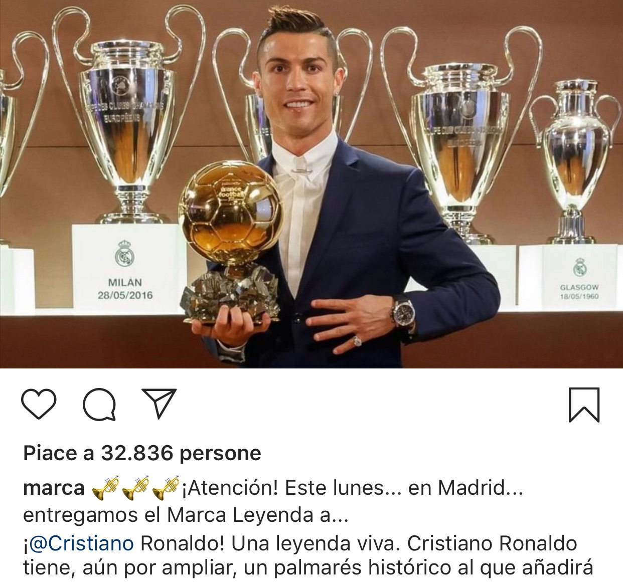 Il “Marca Leyenda” è stato istituito nel lontano 1997 quando fu Michael Jordan a ricevere la prima edizione del premio che ha come obiettivo quello di premiare i migliori sportivi a livello mondiale, un premio alla carriera. L’ultimo calciatore premiato è stato il messicano Hugo Sanchez ad Aprile 2018, dopo di lui si sono succeduti il lunghista Bob Beamon, il cestista Juan Carlo Navarro ed il pattinatore artistico Javier Fernandez. Cristiano Ronaldo sarà il primo portoghese a ricevere questo prestigioso riconoscimento.