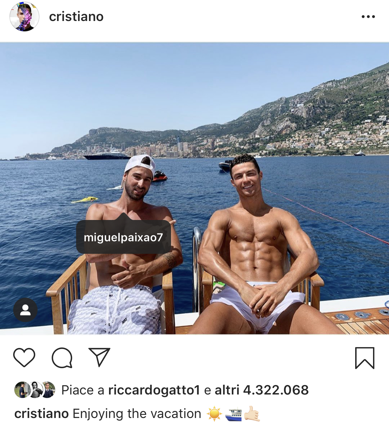 Oggi CR7 ha postato una foto scattata direttamente sulla barca in compagnia di uno dei suoi più cari amici, Miguel Paixao suo ex compagno dello Sporting Lisbona ed uomo di fiducia che cura il museo CR7, mettendo come sempre in mostra il proprio fisico scultoreo fisico.