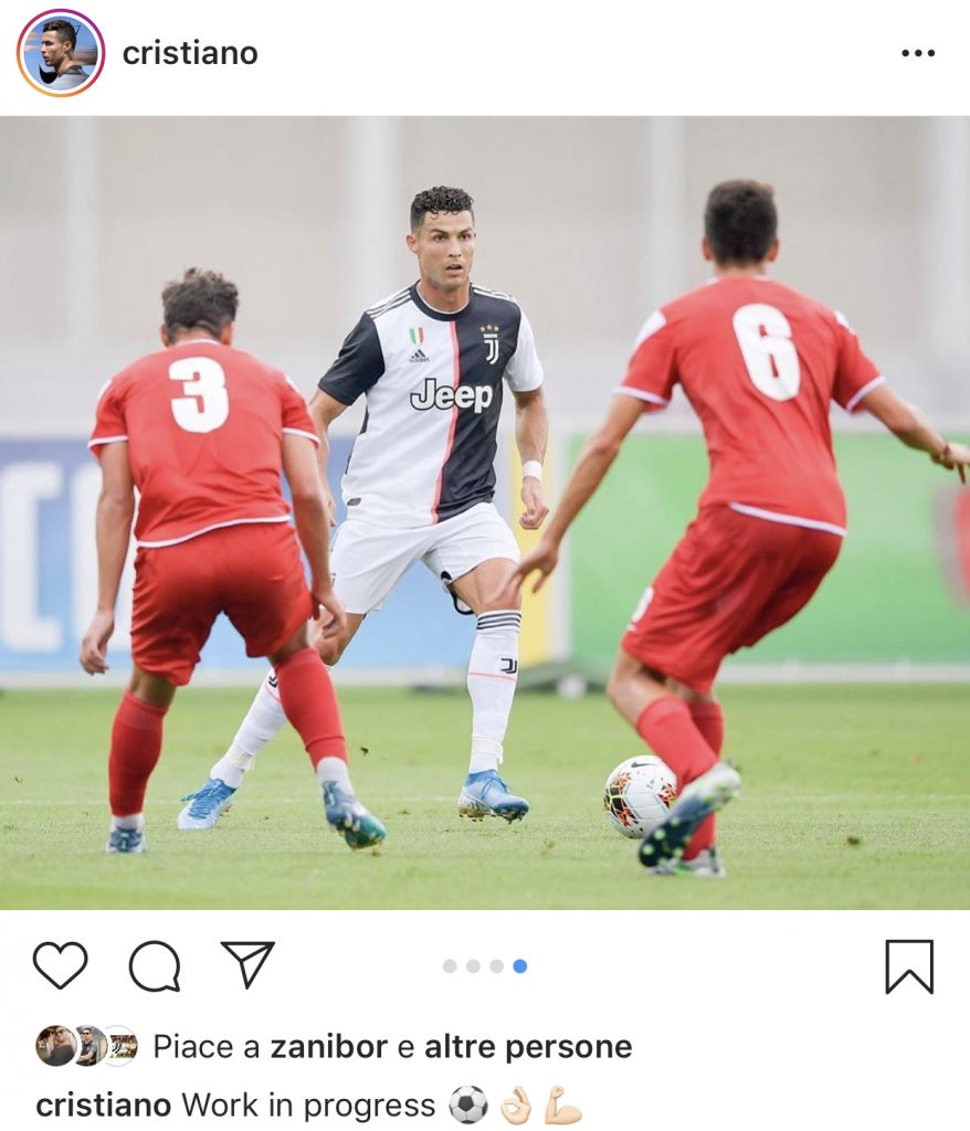Le reti della squadra di Maurizio Sarri sono state realizzate da Higuain, Mandzukic, Dybala e il grande acquisto dell’estate Matthijs De Ligt. Al termine della gara, molti dei giocatori bianconeri hanno postato una foto del match e tra i tanti a spiccare non può che non essere Cristiano Ronaldo che ha pubblicato tre foto sul suo profilo commentandole con un “Work in progress!” dimostrando la volontà del numero 7 di voler crescere la propria condizione in vista di una stagione che i tifosi si aspettano ancor più ricca di soddisfazioni rispetto alla scorsa.