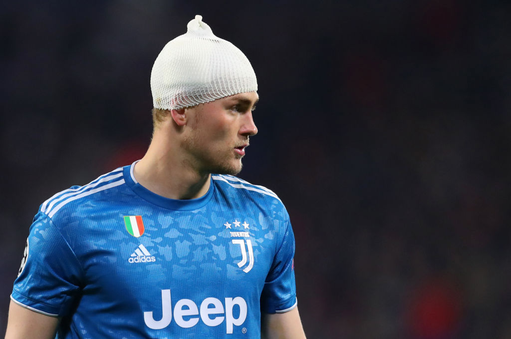 LYON, FRANCE - FEBRUARY 26: Matthijs de Ligt of Juventus wears bandage on his head during the UEFA Champions League round of 16 first leg match between Olympique Lyon and Juventus at Parc Olympique on February 26, 2020 in Lyon, France. (Photo by Catherine Ivill/Getty Images)